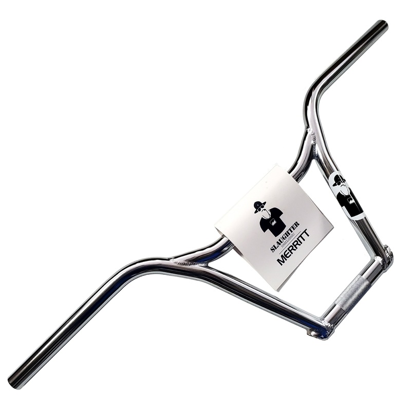 The Merritt Slaughter bars are designed and made to be extra strong without being overbuilt. The bends of the uprights and crossbar provide maximum welding surface area for ultimate strength. Further down, the uprights ovalize and wrap around the stem clamp bar, again maximizing welding area and reducing flex associated with taller handlebars. These handlebars are constructed of multi-butted 4130 chromoly and post-weld heat-treated.