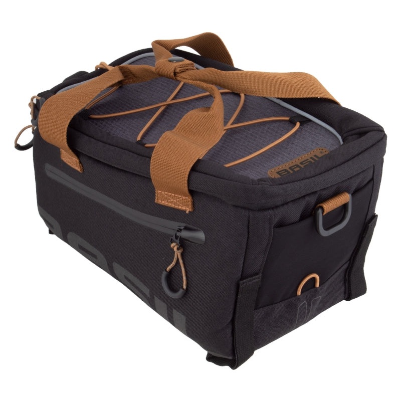 Basil Miles Trunk Bag – 7L Strap Mount Black. The Basil Miles Trunk bag carries up to 7 liters of gear and easily straps to any rear rack. Included handles and detachable shoulder strap allow easy transport off the bike. Polyester material is IPX 3 waterproof to keep everything dry. External pockets and elastic straps allow for easily accessible storage options.