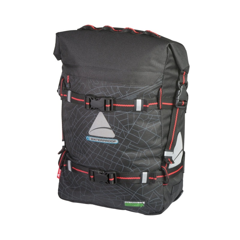 Oceanweave 600D reclaimed fishnet polyester with waterproof polyurethane coating. Hydracore liner provides an exceptional IPX5 waterproof rating. Rixen & Kaul Vario 2 spring-loaded hooks immediately adjust from 6mm-16mm without any need for tools. Compression/cargo straps provide exceptional load control and allow gear to be carried outside of the main cavity – Ideal for unplanned loads faced by commuters. Intuitive waterproof roll-down closure system. Removeable 14.2×10.2 padded laptop/electronics sleeve/organizer. External zippered pocket for keys/wallet etc. Single daisy chain tie down strip for additional load attachment. Ultra-stiff polypropylene backing plate. Ultra-visible three way 3M triangle logos