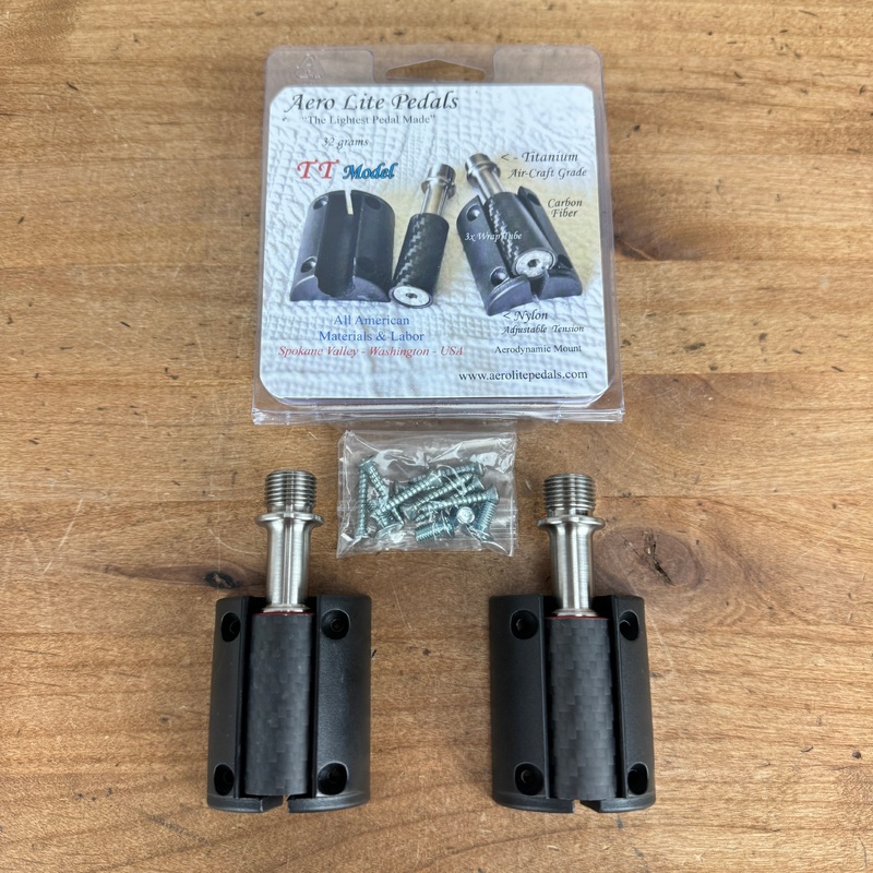 Brand/Model: AeroLite Carbon TT TitaniumThe Aerolite's design is simple - a cylindrical pedal paired with a plastic cleat that wraps 304 degrees around the pedal when engaged. An upward force of over 1300 pounds would be required for the cleat to release w