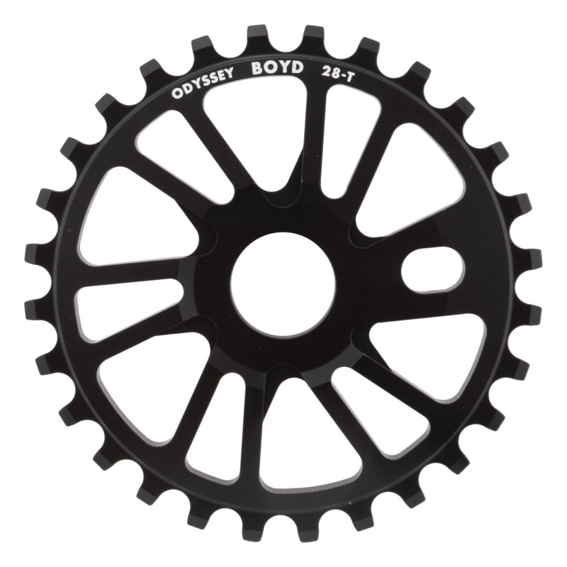 Odyssey Boyd Sprocket - 28T Black. Odysseys Boyd Hilder signature sprocket has a straight-forward five spoke directional design with clean and simple looks.CNC crafted with 7075 aluminumFang inspired dome shape profile with 8mm thickness and 1/8" teeth24mm