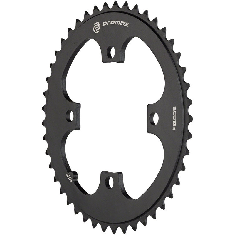 Promax 4-Bolt Chainring - 45t 104 BCD Black. Machined from high-end aluminum Promax 4-bolt 104 BCD chainrings are designed to handle the torque and stress of modern BMX racing and are fully capable in other single speed applications.CNC Machined from high