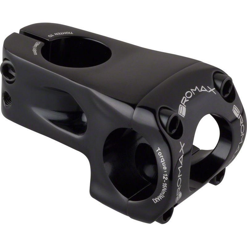 Promax Banger 48mm Front Load Stem +/- 0 degree for 31.8mm Bars Black. Banger stems have a front-load design and can be used with either side up providing a 5-millimeter drop or rise. Available with 48-millimeter and 53-millimeter extensions they are cold forged from the highest quality 6061-T6 aluminum then CNC machined to enhance the shape and further reduce weight.