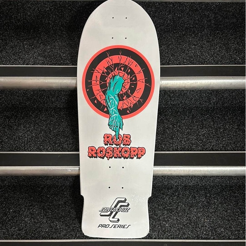 Santa Cruz Skateboards Rob Roskopp One Reissue deck featuring newly remastered OG Roskopp 1 shape with spot matte graphics on full dip white and laser etched deck top reissue logo. 7-Ply North American Maple pressed individually using epoxy - making a stro
