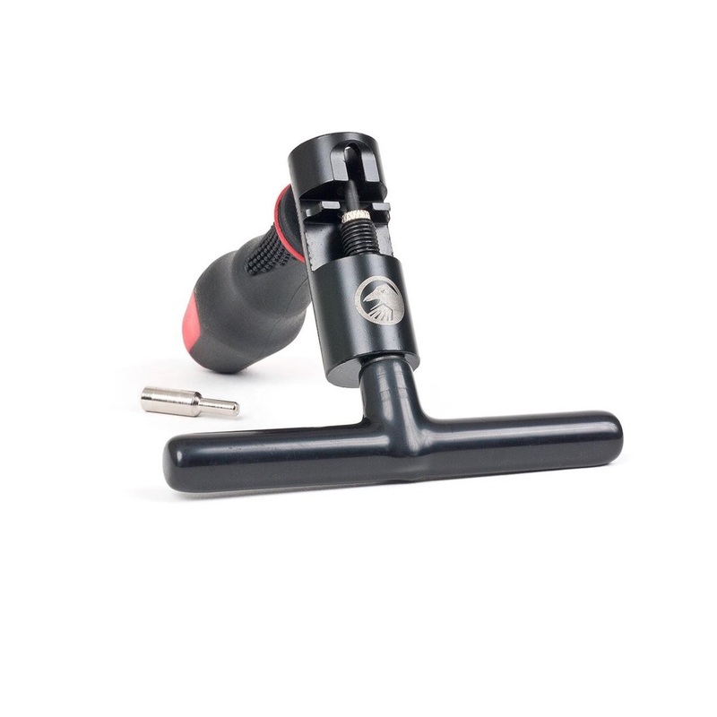 “The Shadow Conspiracy Interlock pro grade chainbreaker is a high quality chainbreaker that will break any single speed chain and install it. It is designed to get any stubborn chain off your frame with a simple twist of the wrist. Made out of heat treated chromoly this tool is extra strong. Both handles are rubber coated and the larger one has bumps to give you extra grip even with greasy hands. The smaller handle threads into the large one and pushes the pin out of the chain link. The large one has an alignment machined into it to guide the chain on the chain breaker making it super simple to use. The threads on the smaller one are thick to prevent stripping and go all the way up to the handle to give you maximum removal. The Large base has a black anodized finish with a TSC logo laser etched into it. If you are tired of chain breakers failing on you, buy one of these today. “
