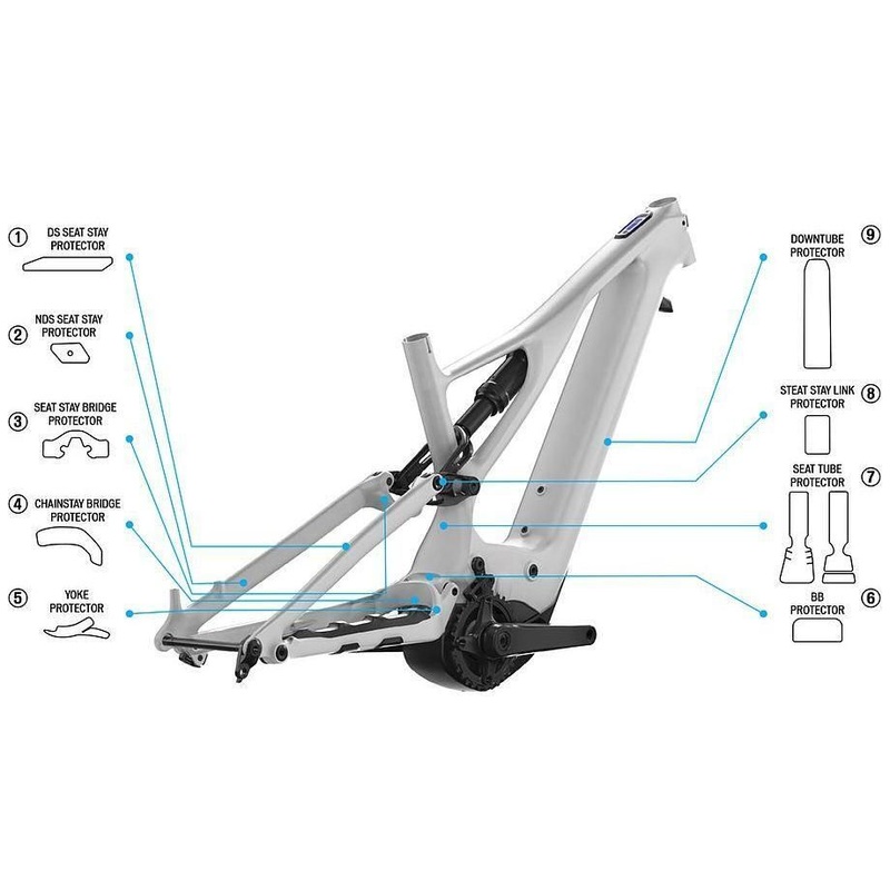 A comprehensive replacement kit of die-cut mylar protector decals for 2019-2021 Turbo LevoMylar Downtube ProtectorMylar Seat Tube ProtectorsMylar Seatstay ProtectorsMastic Chainstay ProtectorNine piece kitOriginal Specialized Turbo Levo Mylar Replacement C