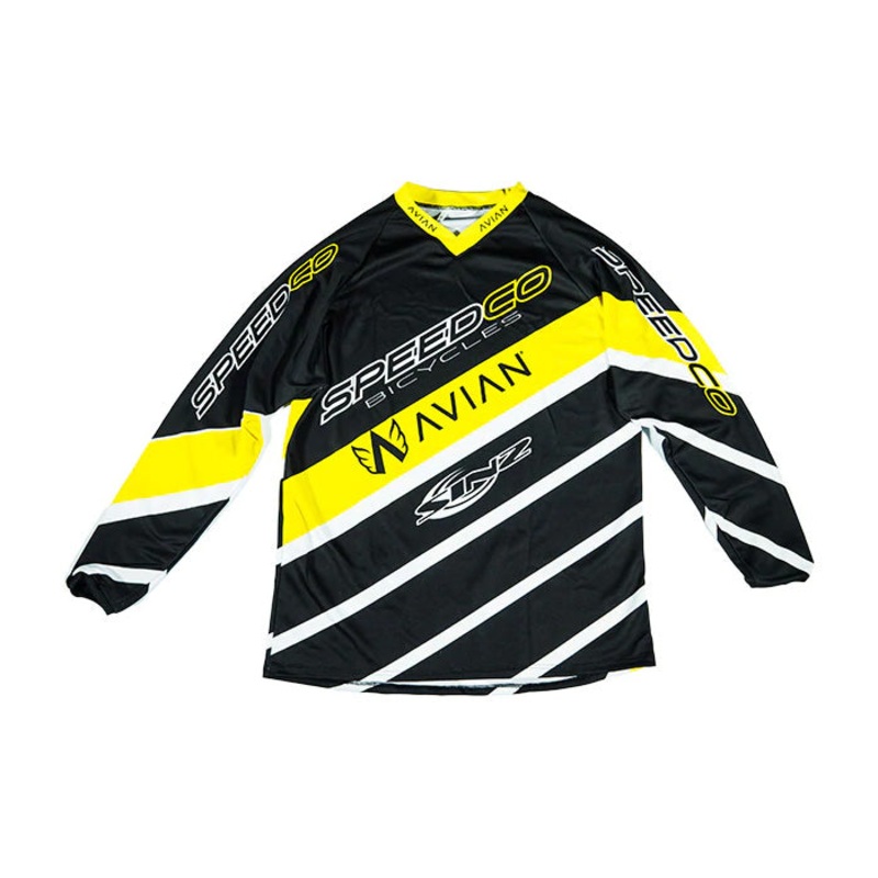 The Speedco Race Jersey-Black/Yellow at J&R Bicycles is designed to not just look good but feel good and provide a fit that allows you to perform your best. Made of 100% polyester this jersey is durable enough to stand up to whatever you end up getting into and is easily machine washable. Designed and printed by the pros at Custom Racing, this race jersey features bold Speedco and Avian logo graphics.