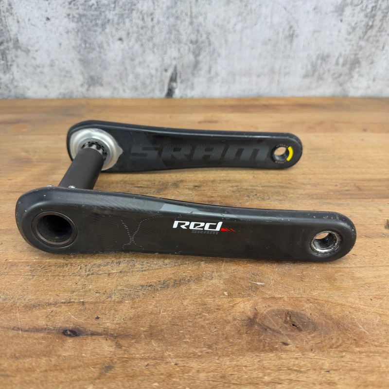 Brand/Model: SRAM Red 22Material: CarbonCrank Arm Length: 175mmSpindle:GXPCrank Arm Mount Type: Sram 8-Bolt Direct MountWeight: 438 gramsCondition: Typical scratching and shoe rub on the crank arms from prior use. Some finish wear may be present in other a