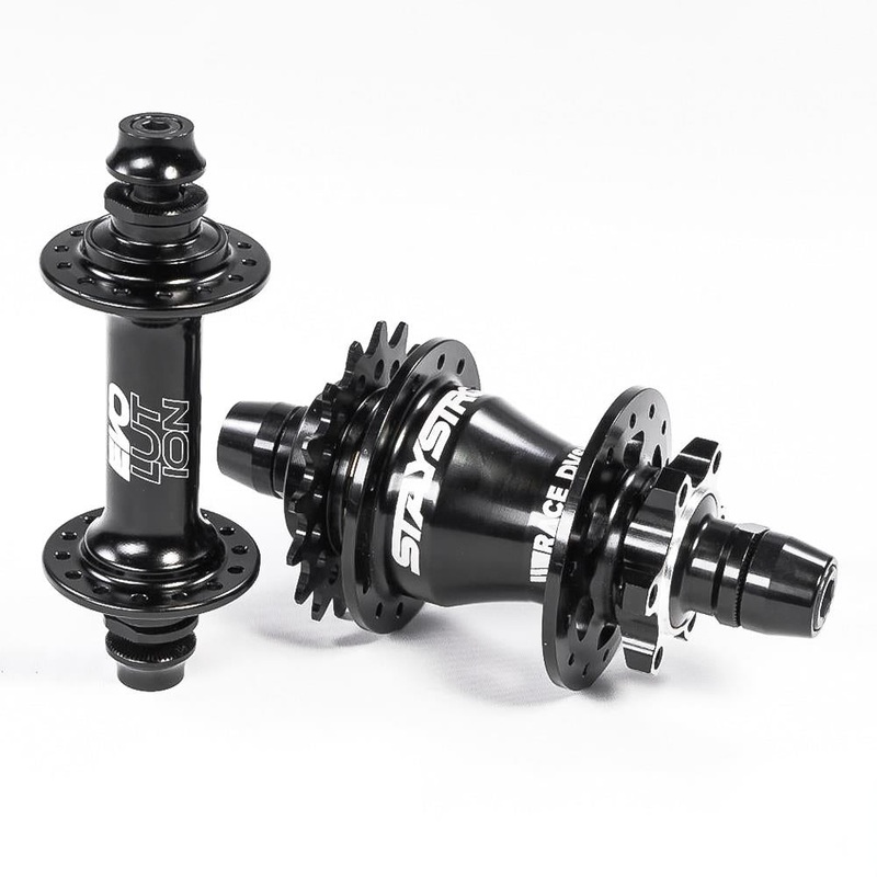 Stay Strong Race DVSN DISC Hubset: Expert 28H. Reactiv Front Hub 10mm: Alloy fully sealed, 28 Hole, Alloy female axle, Race DVSN Rear DISC Hub: Alloy fully sealed, 28 Hole, Hollow axle, 6 Pawl, 180 points of engagement, Alloy 7075 16T Cog, New Branding on