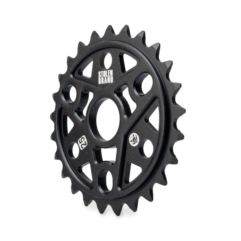 “The Stolen Sumo lll sprocket is a high grade 6061aluminum sprocket design to take a beating. Cnc machined this sprocket is perfectly straight and will help eliminated you tight loose spots in your chain. The matte anodized finish and the laserStolen logo on the front makes this sprocket look amazing. All the teeth are tapered for smooth pedaling and compatibility with any 1/8 chain. If you want a heavy duty sprocket at a low cost, pick up one of these today.”