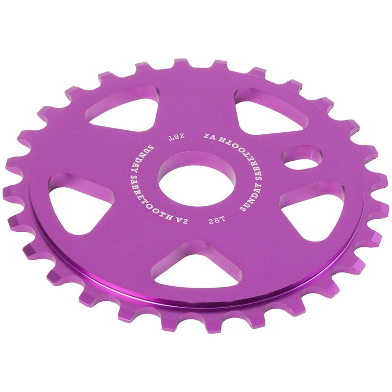Sunday Sabretooth V2 Sprocket – 28t Anodized Purple. The Sunday Sabretooth V2 sprocket is a 6mm (1/4) thick 6061-T6 aluminum sprocket.