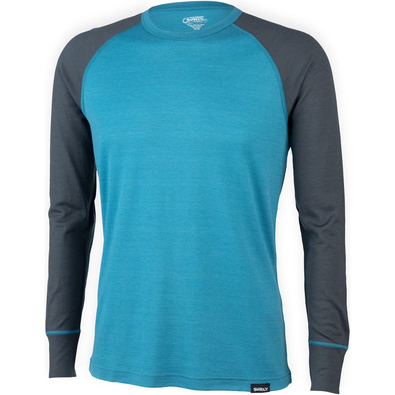 Surly Raglan Merino Long Sleeve Shirt: Blue/Gray XL. Made from lightweight Merino wool the Surly Raglan is comfortable for a wide range of conditions. Its ideal on its own when temps arent too chilly or for layering when its colder.100% Merino Wool is a na