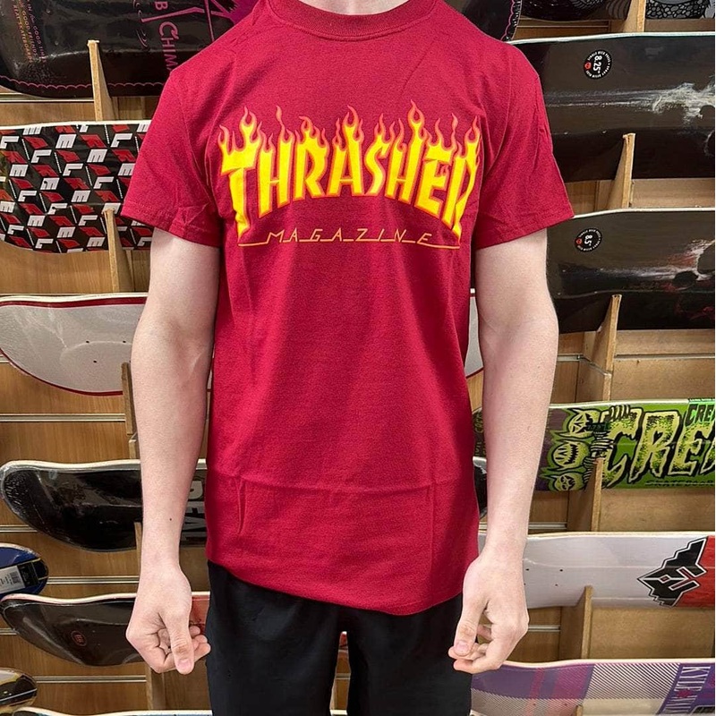 Heavyweight, 100% pre-shrunk cotton T-shirt features the Thrasher skateboardFlame logo on a Cardinal Red tee.Thrasher:The Bible.King of the Road. Skater of the Year. Hall of Meat. Skate Rock. Prevent This Tragedy. Double Rock. Skarfing Material. Somethin'
